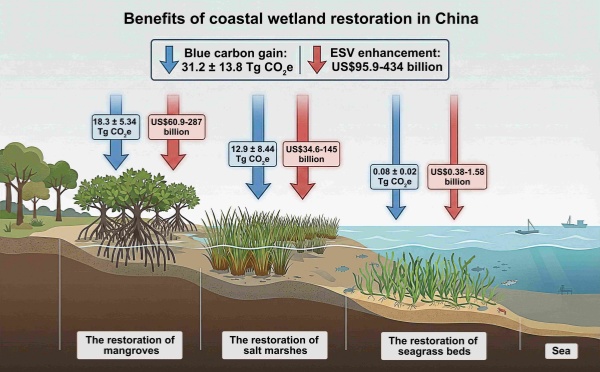 该研究为理解滨海湿地修复的生态经济效益提供了一个全新的视角。上述研究成果以“Investment in coastal wetland restoration yields high returns in blue carbon and ecosystem services in China”为题在线发表在Nature旗下期刊Communications Earth & Environment (https://doi.org/10.1038/s43247-026-03458-3)。博士研究生周金戈为论文的第一作者,王法明研究员为论文通讯作者。该项研究得到项目获得国家重点研发计划、香港RGC战略主题专项和欧盟地平线旗舰计划以及国家自然科学基金等项目的支持。